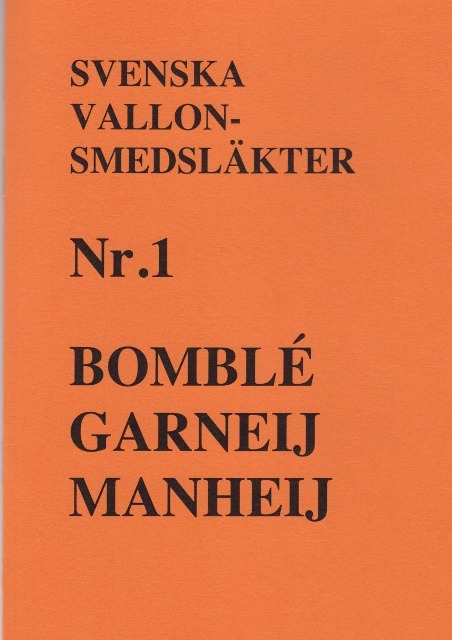 Svenska Vallonsmedsläkter Nr 1 innehåller släkterna Bomblé, Garneij och Manheij